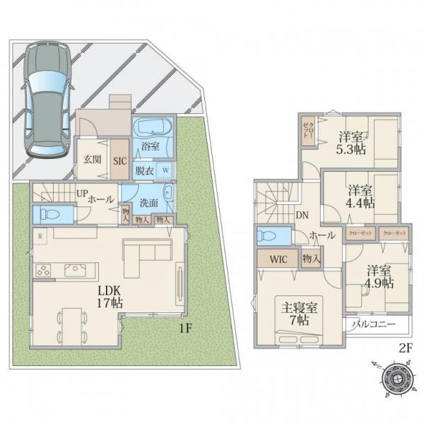 カースペース2台駐車可、6m道路で車のすれ違いも容易です。